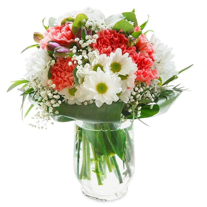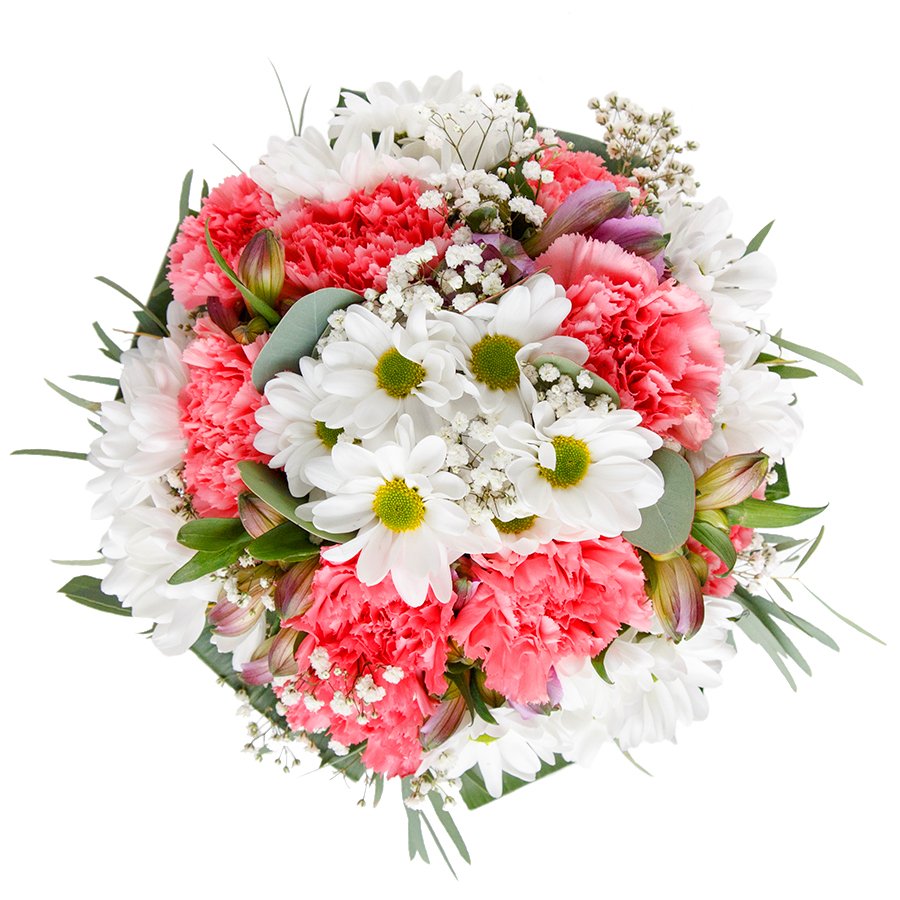 Send a touch of elegance with our elegant and unique flower bouquet. This sophisticated arrangement features snow-white chrysanthemums, graceful gypsophila, and light pink carnations, beautifully complemented by vibrant aspidistra leaves.